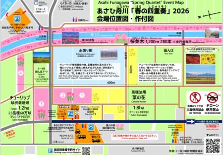 <鑑賞のマナー> 1.チューリップは病気に弱い植物です。土から広がる病気を防ぐため、畑の中やあぜ道には、絶対に入らないでください。 2.ロープや、看板から先には入らないようにしましょう。 3.大切なチューリップを守る農家さんの営みとして、消毒のためチューリップに農薬を撒くことがあります。農薬散布の作業をしている場合は風上に移動するようにしましょう。(水撒きと間違わないようご注意ください) 4.菜の花やチューリップは勝手に摘み取ることが禁止されています。大事に育てられた花々はマナーを守って鑑賞しましょう。 5.混雑している場所での三脚の使用は禁止。 6.イベント期間中は、ドローンによる空撮を禁止。 7.ゴミはお持ち帰りください。 |