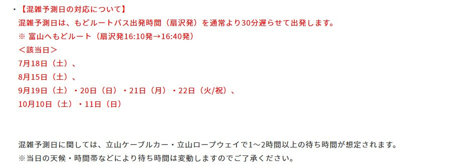 | ⚠︎混雑予測日の対応について | シーズン期間中の混雑が予想される該当日は、バスの出発時間を30分遅らせて出発いたします。その後の行程時間もすべて後ろ倒しとなります。ご予定の際は、時間変更にご注意ください。 詳しくは➡こちら |